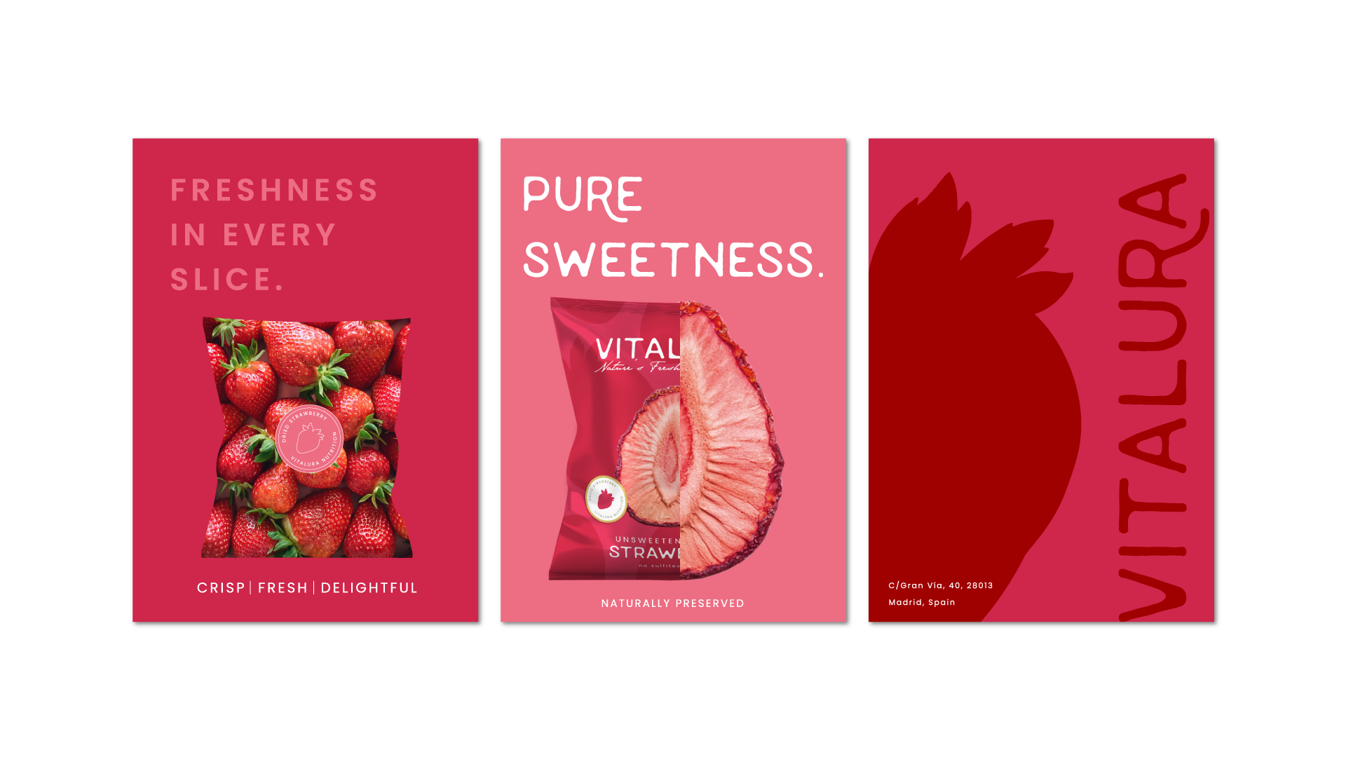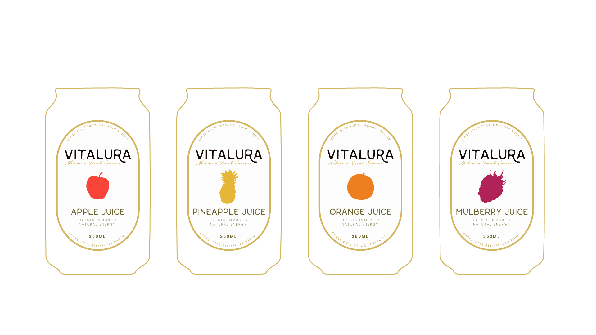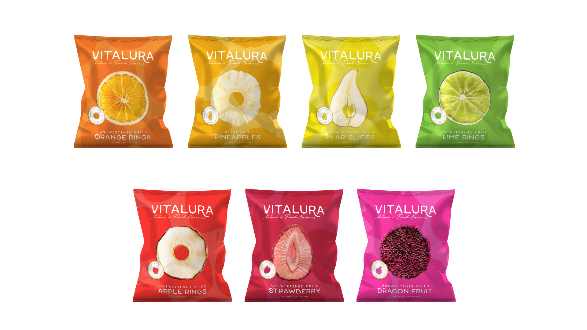 Vitalura’s packaging showcases vibrant colors that embody the freshness and vitality of the fruits within. Each design uses bold, lively hues that capture the essence of nature, creating an inviting and energetic look. The dynamic colors highlight the pure, natural ingredients, evoking a sense of health and enthusiasm that resonates with those seeking a refreshing lifestyle.